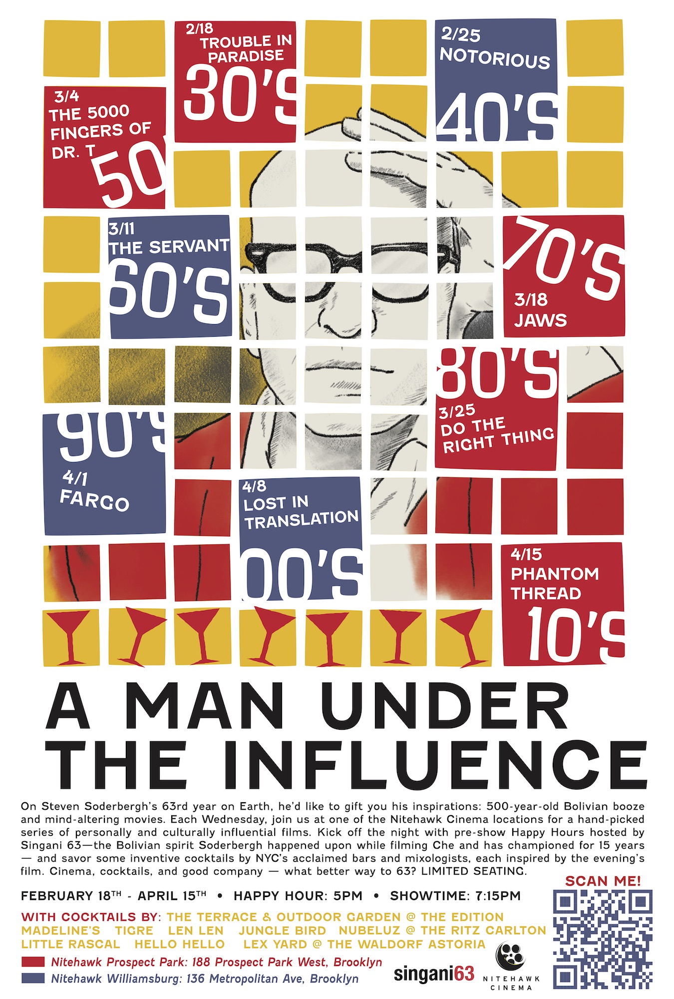 Every Wednesday from February 18th – April 15th, join us at one of the Nitehawk locations for a hand-picked series of personally and culturally influential films. Kick off the evening with pre-show Happy Hours hosted by Singani 63 — the Bolivian spirit Soderbergh happened upon while filming CHE and has championed for 15 years — and savor some inventive cocktails by NYC’s acclaimed bars, each inspired by the evening’s film. Cinema, cocktails, and good company — what better way to 63? LIMITED SEATING.