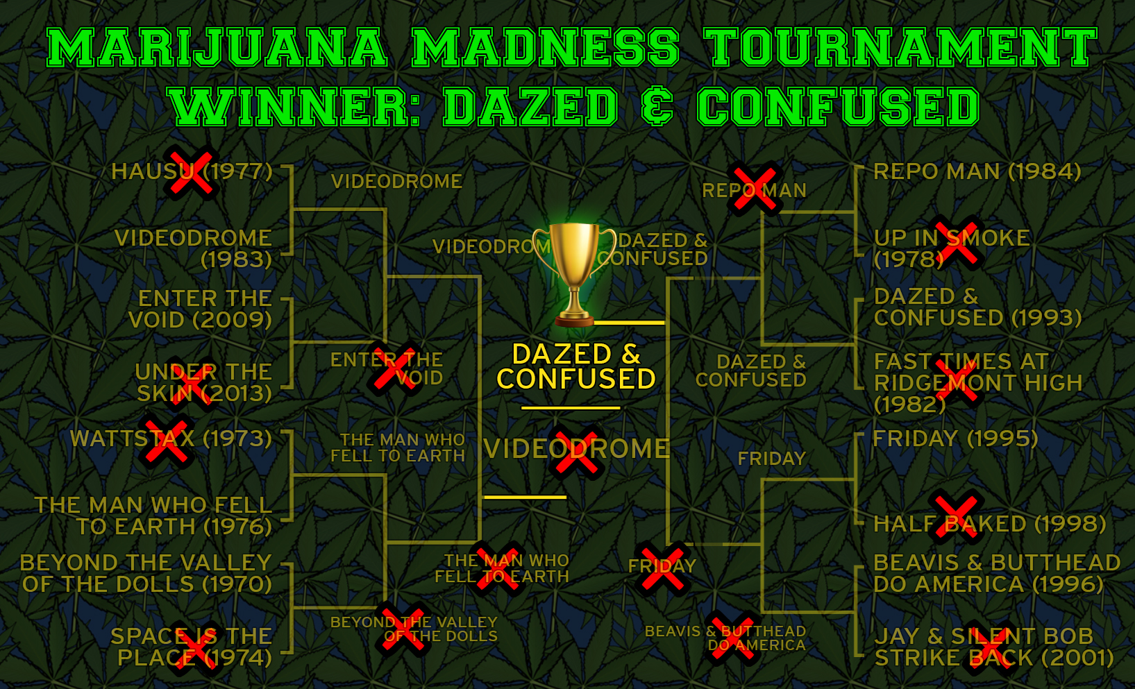Update: The results are in! The winner of this year’s MARIJUANA MADNESS TOURNAMENT is Richard Linklater’s DAZED & CONFUSED, which beat out David Cronenberg’s Videodrome in the finals 227 – 203